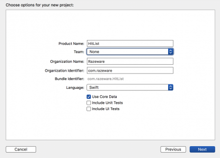 Open Xcode and create a new iOS project based on the Single View App template. Name the app HitList and make sure Use Core Data is checked.