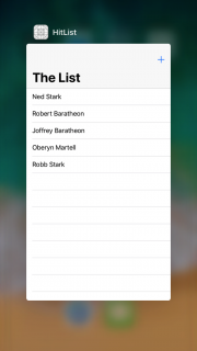 If the names are actually stored in Core Data, the HitList app should pass the persistence test. Double-tap the Home button to bring up the fast app switcher. Terminate the HitList app by flicking it upwards.