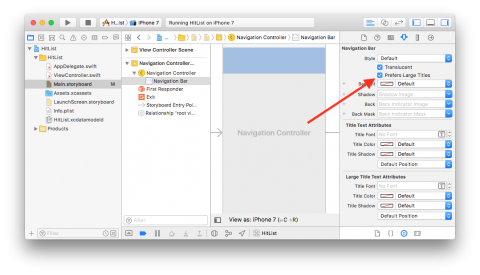Click on the navigation controller’s navigation bar to select it, then click on Prefers Large Titles in the Attributes Inspector. This will give the sample app a fresh iOS 11 style.