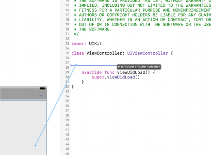 Open the assistant editor by pressing Command-Option-Enter or by selecting the middle button on the Editor toolset on the Xcode bar. Delete the didReceiveMemoryWarning() method. Next, Ctrl-drag from the table view onto ViewController.swift, inside the class definition to create an IBOutlet.