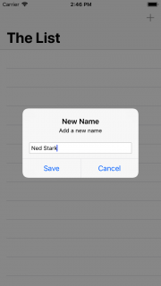 Every time you tap the Add button, an alert controller containing a text field will appear. From there you’ll be able to type someone’s name into the text field. Tapping Save will save the name, dismiss the alert controller and refresh the table view, displaying all the names you’ve entered.